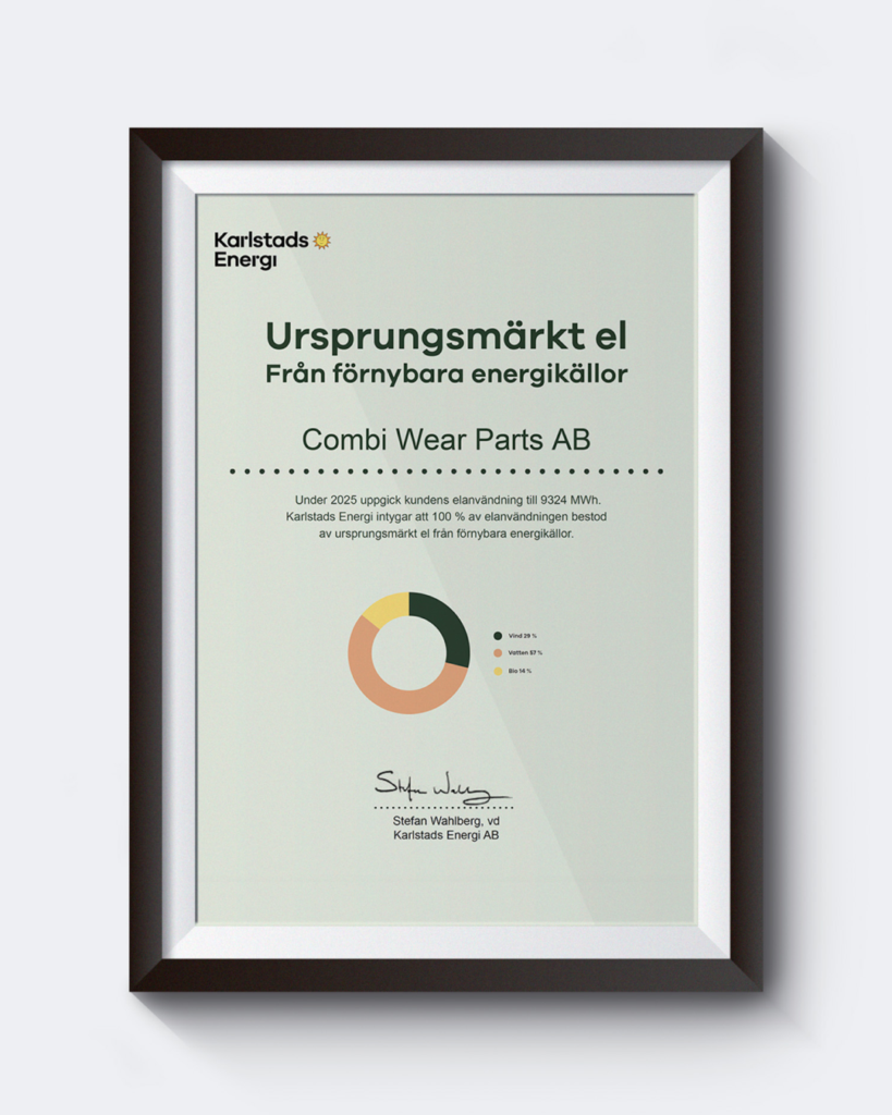 Under 2025 came 100% of Combi Wear Parts’ electricity consumption from renewable energy sources, certified by Karlstads Energi.